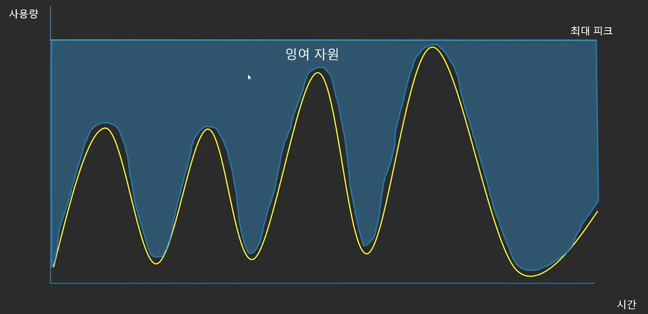 그림은 물리 서버를 사용했을 때 최대 피크에 해당하는 서버 구축으로 낭비되는 자원이 너무 많다. 클라우드는 피크에 해당하는 비용만 지불하면 되어서 낭비되는 자원에 따라 낭비되는 비용 미발생
