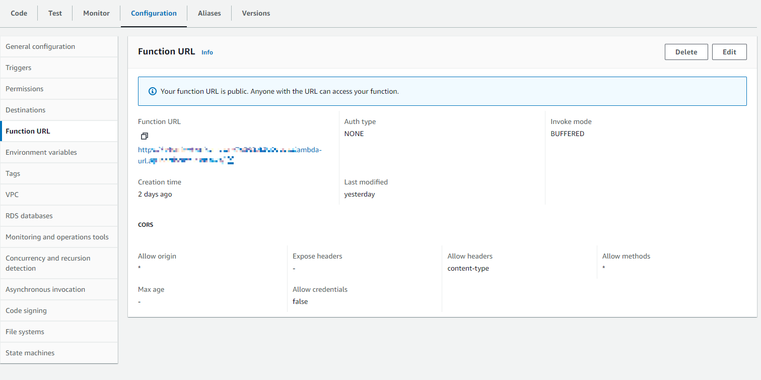 이 function URL을 호출해서 서비리스 기능을 사용할 것이므로 function URL을 생성해주면 된다.