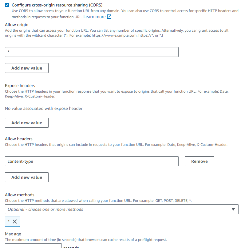funcion URL 설정은 아래와 같이 설정해 주었다. 참고로 CORS를 해야하는 경우 CORS설정을 함수에 적용해주면 되는데 설정 관련 글을 참고해서 해결하자. CORS설정이 안되어 있다면 아래 사진에서 CORS(enable)이라고 뜰 것이다. 나는 설정을 해주었기 때문에 enable이라고 뜨지 않는다.