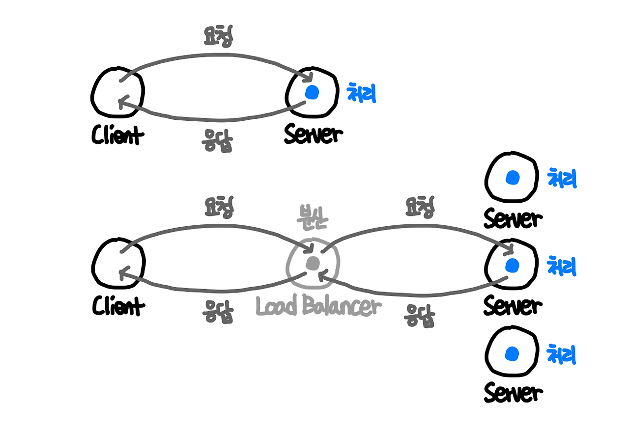 트래픽 이슈 해결: 아무리 많은 요청이 들어와도 로드 밸런서 뒷단에 서버 수만 늘리면 된다. -> 수평적 확장