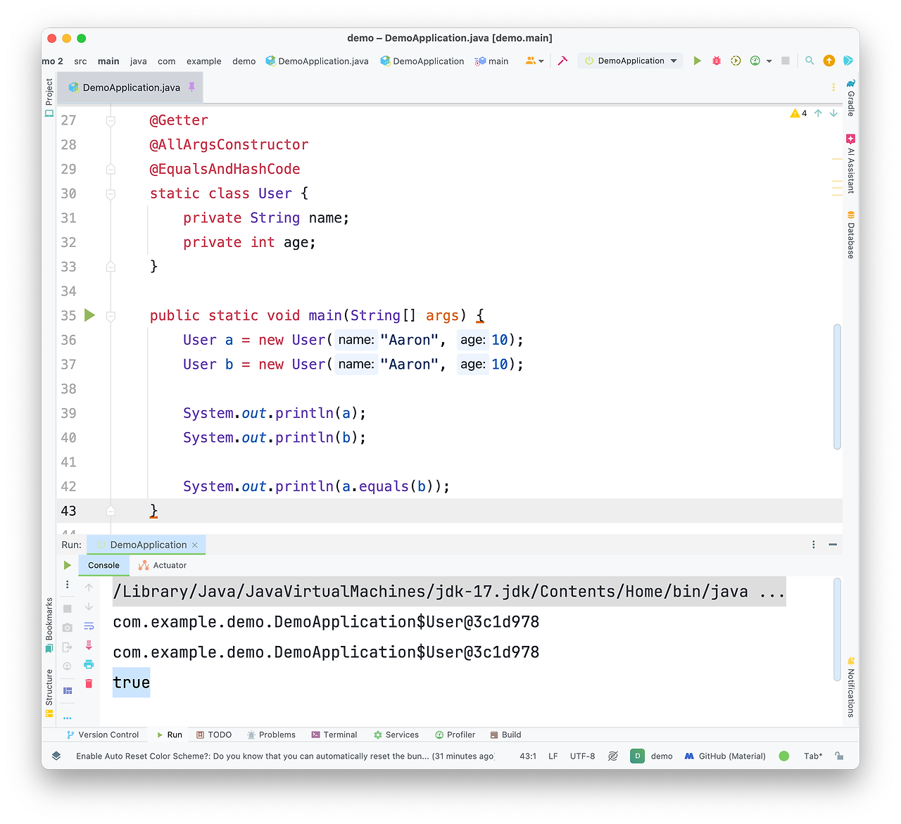 자바에서 `equals()`의 동작 원리가 hashCode메서드를 기반으로 하므로 객체의 필드 값이 모두 동일하면 `true`를 반환하는 걸 확인할 수 있다.