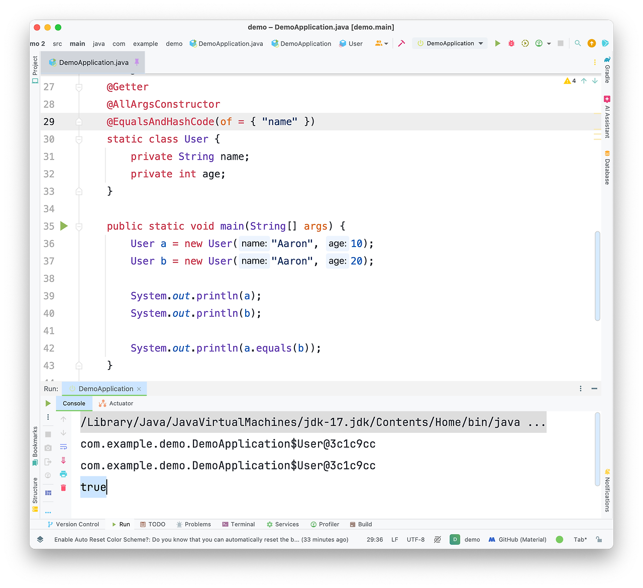 추가로 hashCode가 기반으로할 필드들을 아래와 같이 지정할 수 있다. (일반적으로 ORM을 위한 entity클래스 정의 시 `EqualsAndHashCode` 기준값을 ID로 설정한다.)