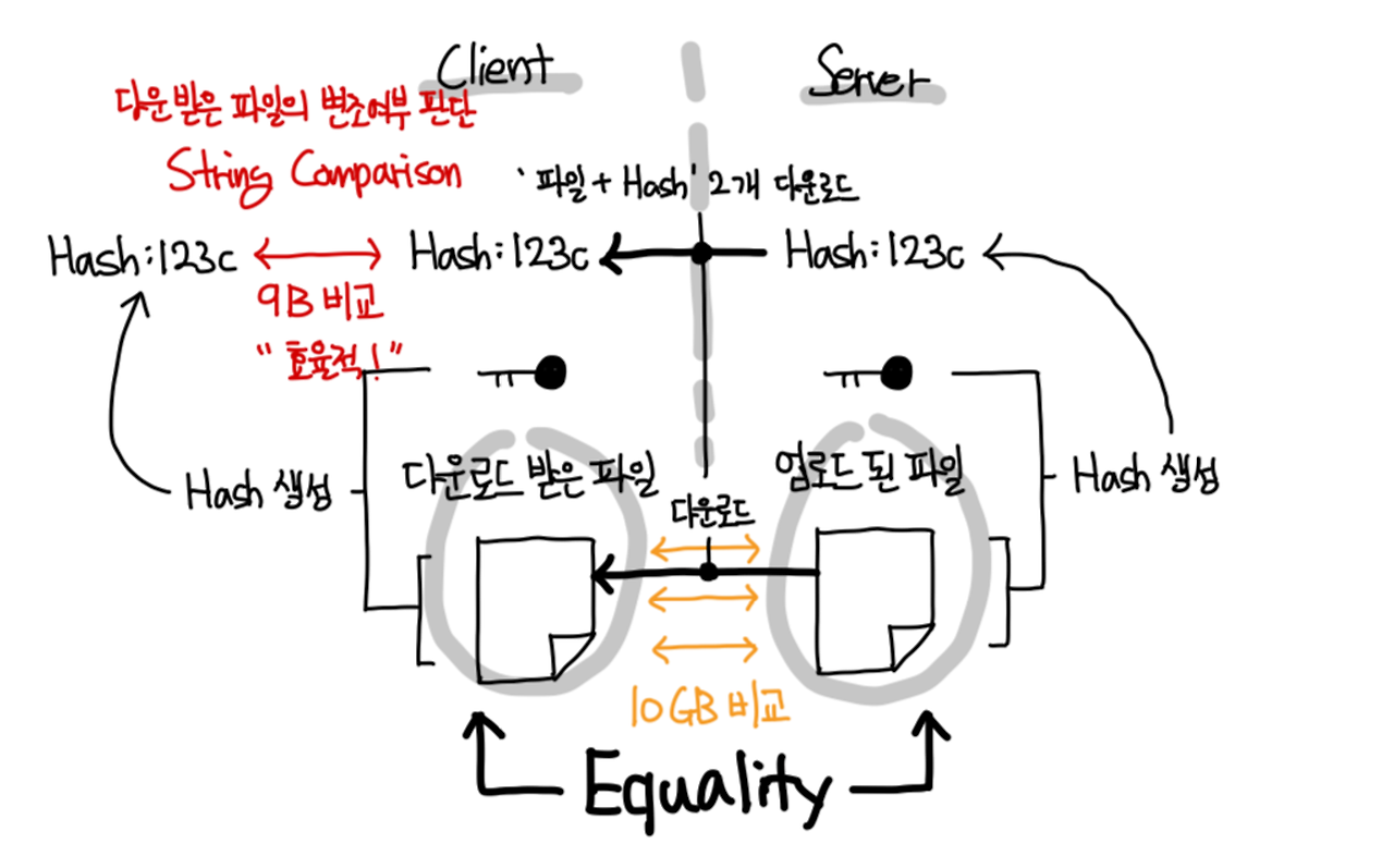 - 파일을 다운 받거나 혹은 API결과와 동시에 서버가 파일 혹은 API결과로 계산한 Hash값을 함께 받는다.