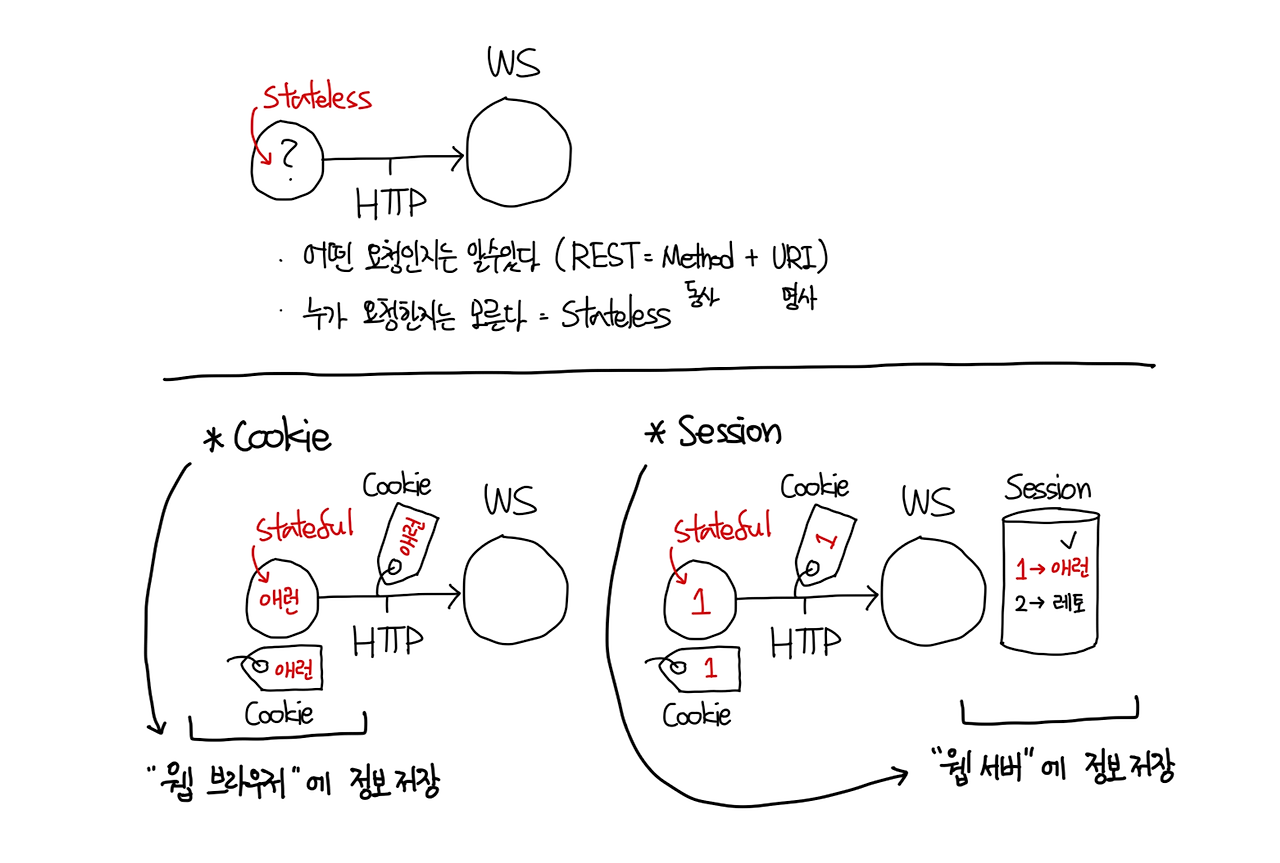 stateful http로 사용하기 위해 cookie와 seesion을 사용하는데, 요청자 정보를 어디에 저장하는지에 따라 두개로 나뉜다.