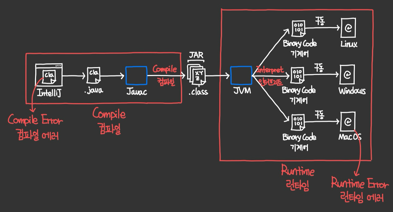bytecodes(.class) -> (자바엔진(JVM)을 통해) -> 기계어(binary code)