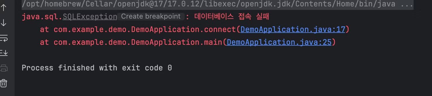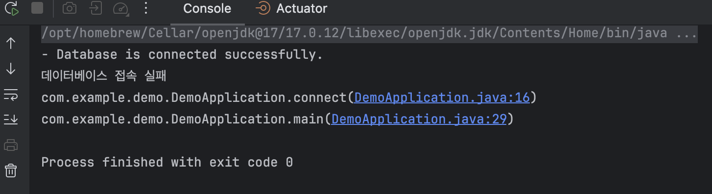 - 데이터베이스 유저네임과 비번이 틀렸다는 예외는 어플리케이션을 구동해야 알 수 있는 에러임