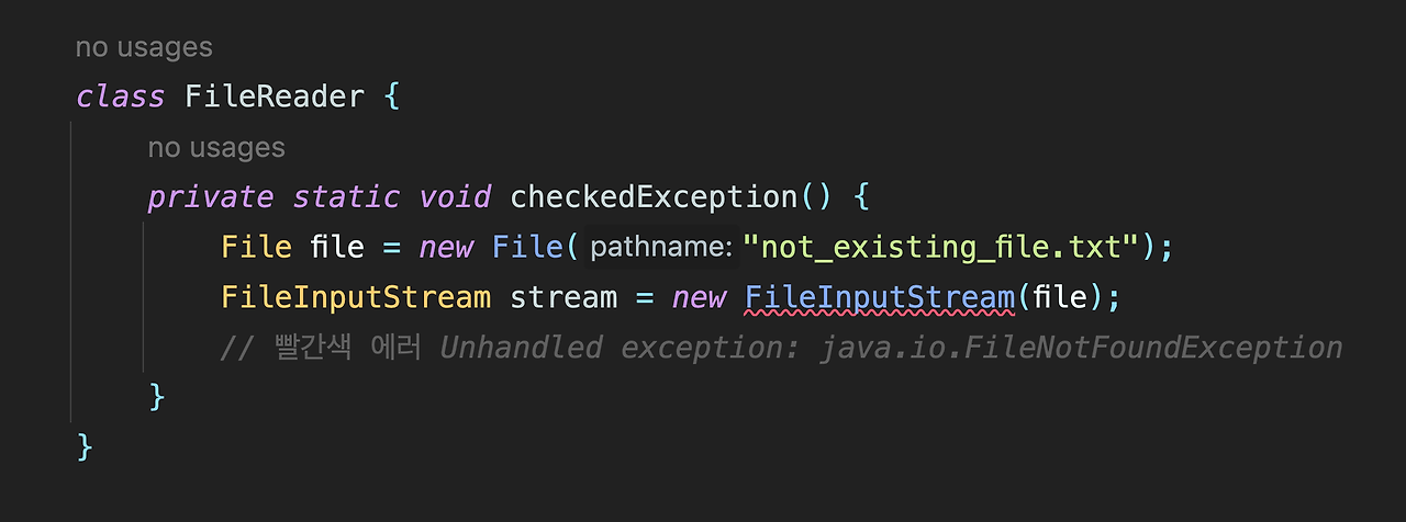 - 예외 처리 했는지 여부를 컴파일 시간에 검증: 개발 시 IDE에서 빨간색으로 표기