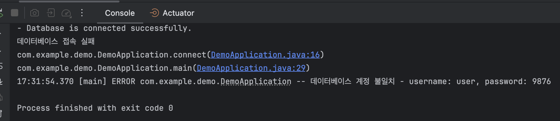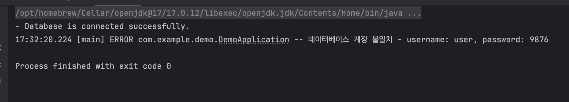 log.error(String.format("데이터베이스 계정 불일치 - username: %s, password: %s", username, password));
