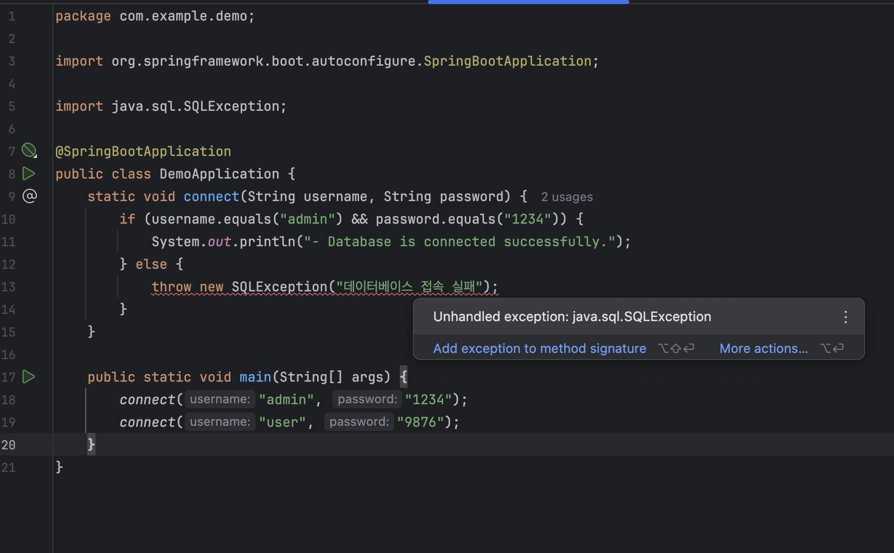 이 빨간색 에러를 해결하려면, Java Exception을 처리하면 된다 (예외 처리하는 방법 2가지)