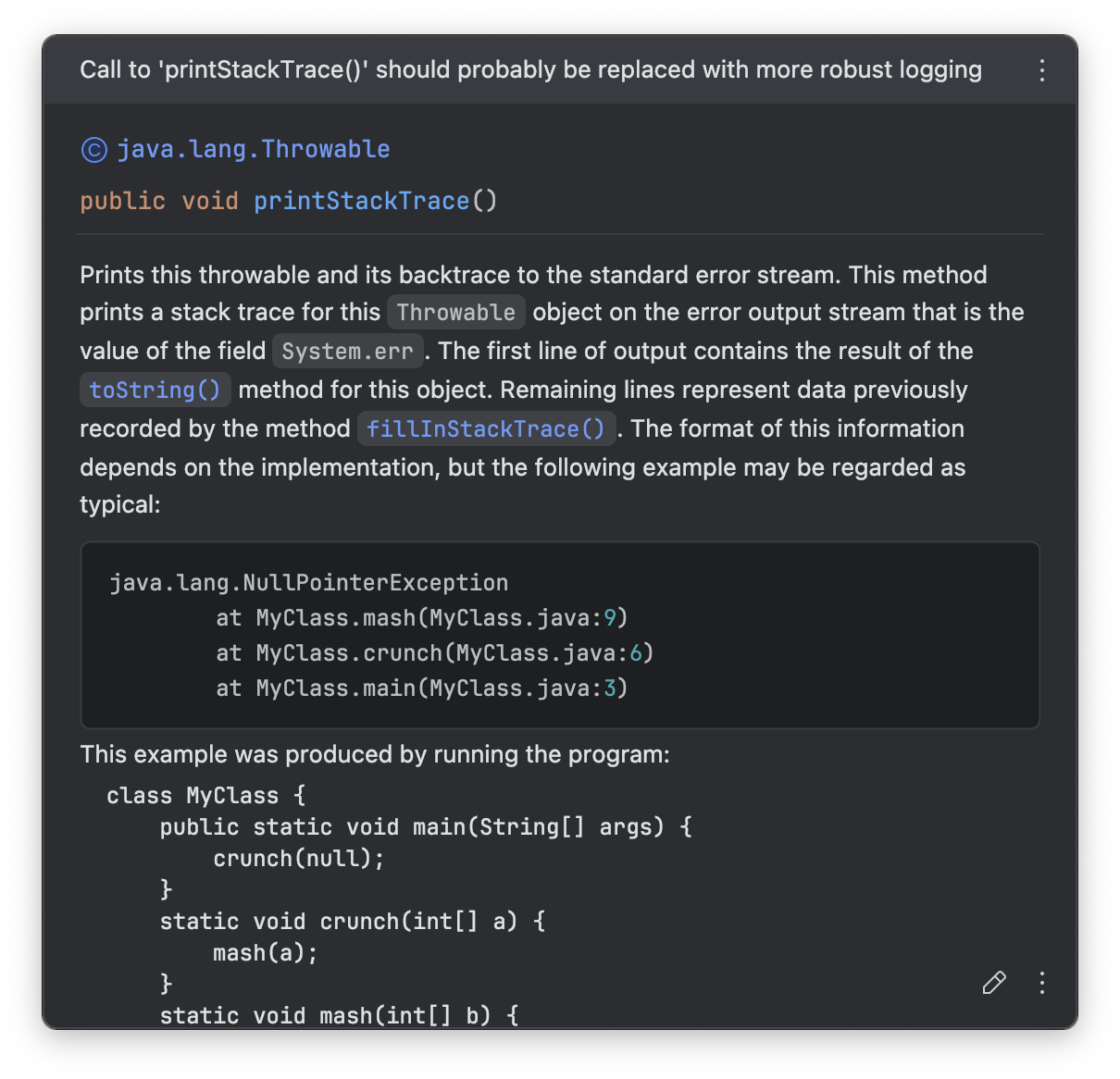 Exception 처리를 위해 쓰는 `Throwable.printStackTrace()` 사용 관련 안내
