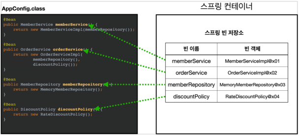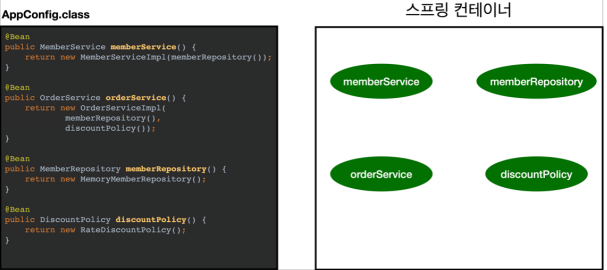 - AppConfig 를 사용했던 방식이 애노테이션 기반의 자바 설정 클래스로 스프링 컨테이너를 만든 것이다.