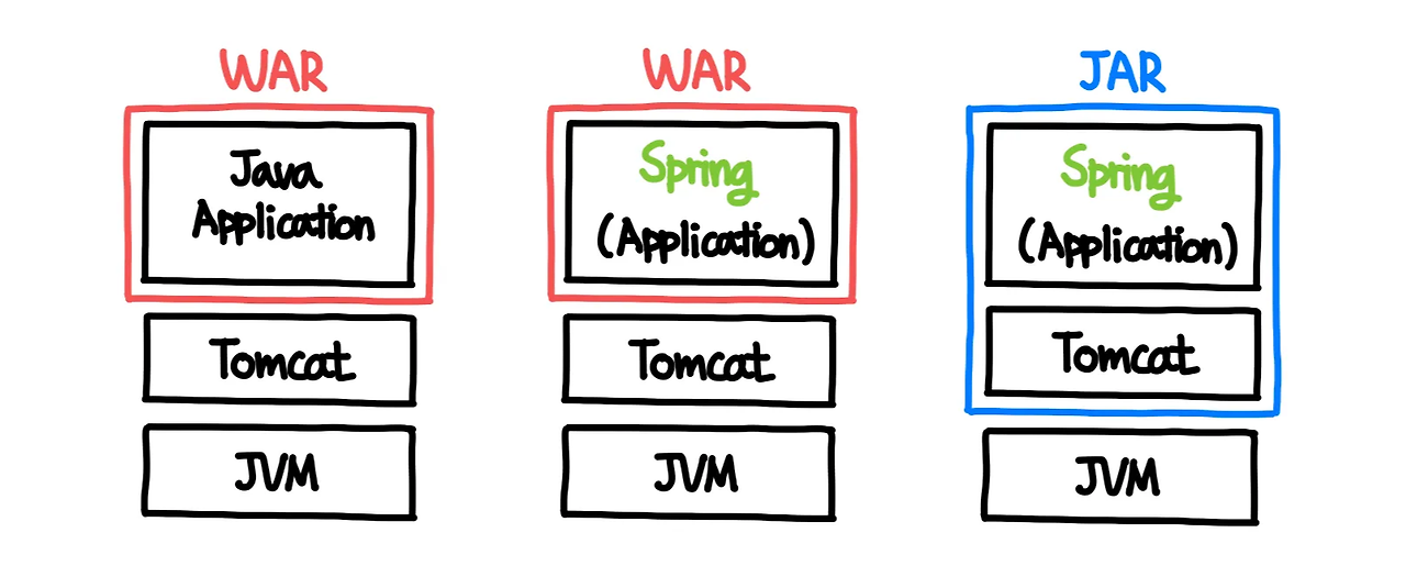 Tomcat + Spring 구조는 위와 같다 = JAR(JVM) + Tomcat(Servlet) + Spring(Controller)