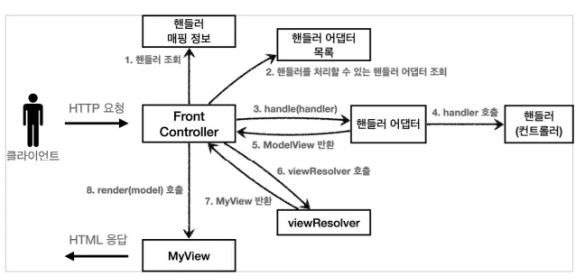 - 핸들러 어댑터를 통해서 조회한 핸들러를 처리할 수 있도록 변환, 어댑터가 핸들러(컨트롤러 대신 호출)