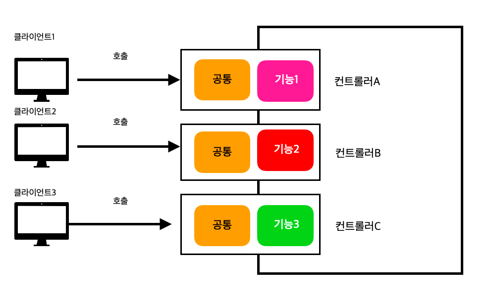 단일 Servlet(DispatcherServlet) 이 요청 URL마다 컨트롤러 호출