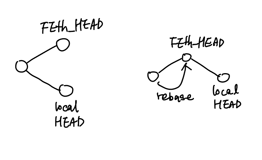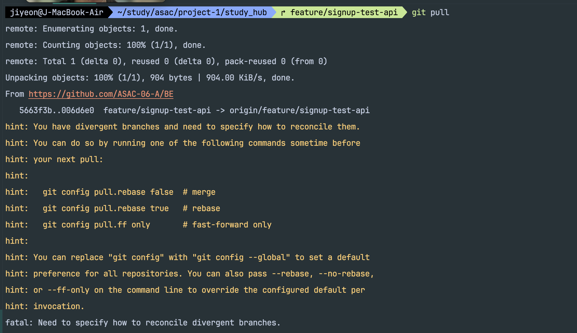 이후 로컬에서 pull을 하려니까 위 사진과 같이 pull이 되지 않았다. 새로운 커밋을 남기지 않고 pull 할 수 있는 방법인 `rebase` 를 사용해서 문제 해결.