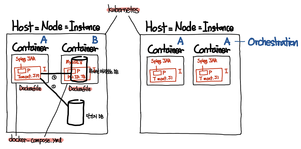 - 어플리케이션 = 컨테이너 조합 (컨테이너는 격리된 공간에서 프로세스가 동작하는 기술)