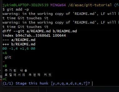 이 옵션은 변경된 파일에서 변경된 부분을 라인별로 선택해서 `add` 할 수 있는 옵션이다.