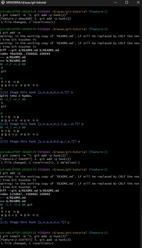 위 명령어로 파일 내에서 변경된 내용을 쪼개서 추가할 수 있다.