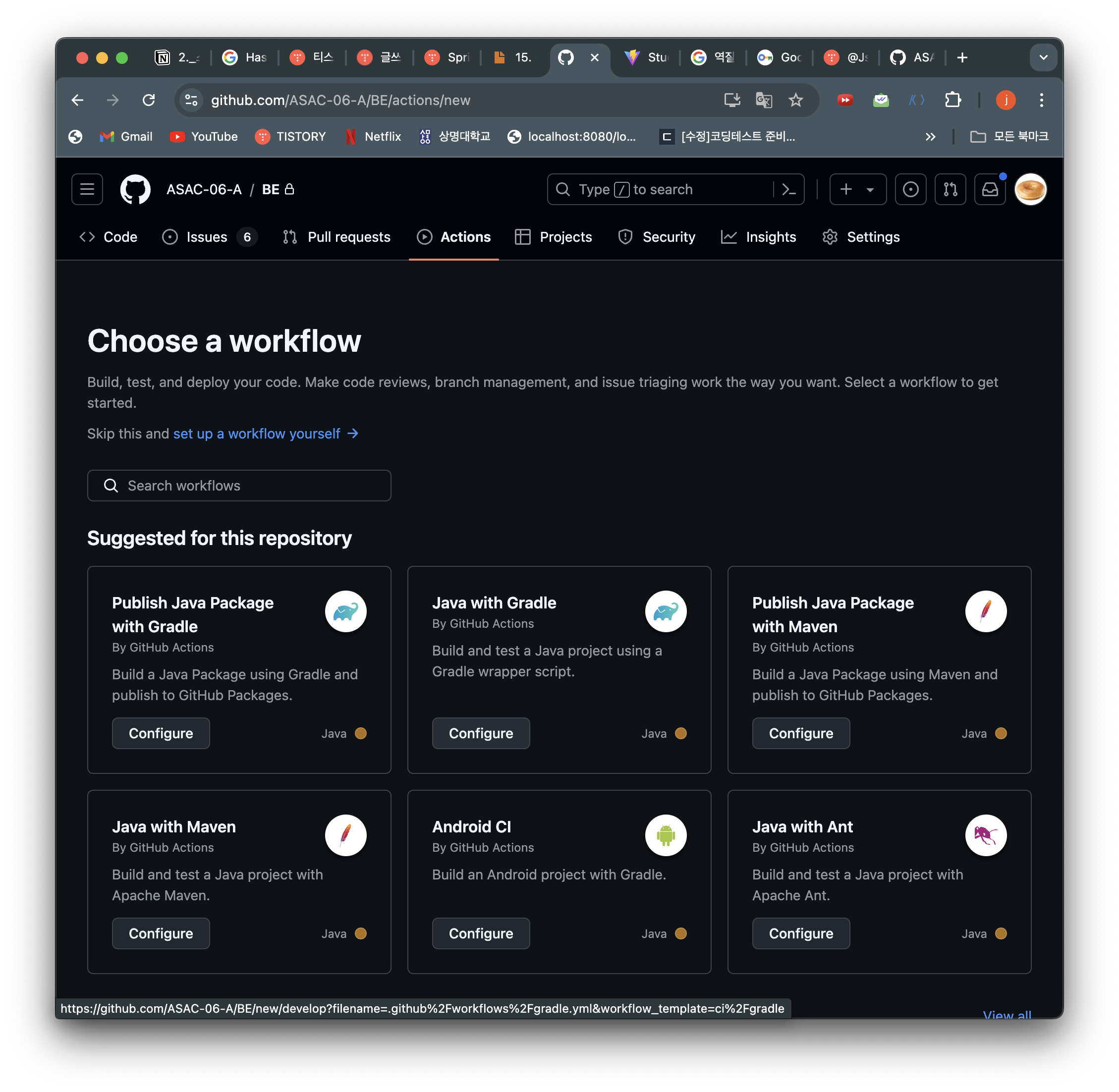 공식문서에 나온대로 "Java with Gradle" 을 선택해서 "Configure" 버튼을 누르면 알아서 '.github/workflows' 에 `gradle.yml` 파일을 생성해준다.