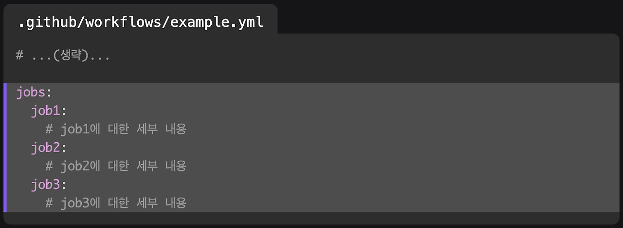 - 하나의 워크플로우는 여러 개의 Job 으로 구성되며 적어도 하나의 Job 은 있어야한다.