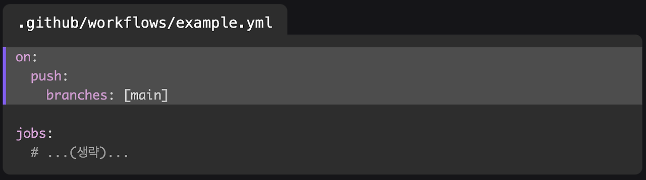 - 브랜치 기준: 어떤 브랜치에 어떤 액션(Push 혹은 Pull Request 등) 이 발생했는지 기준으로 작업 수행