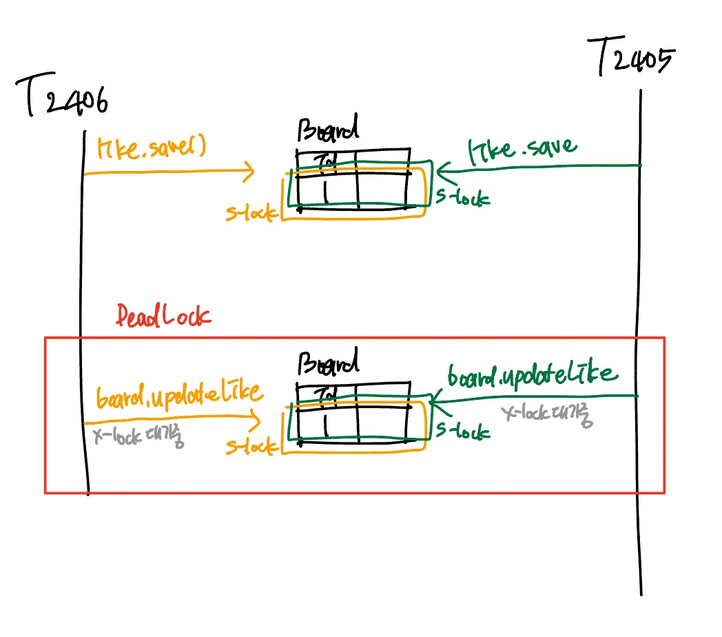 t1게시글 좋아요 업데이트를 위해 xlock 획득해야함 → 대기중