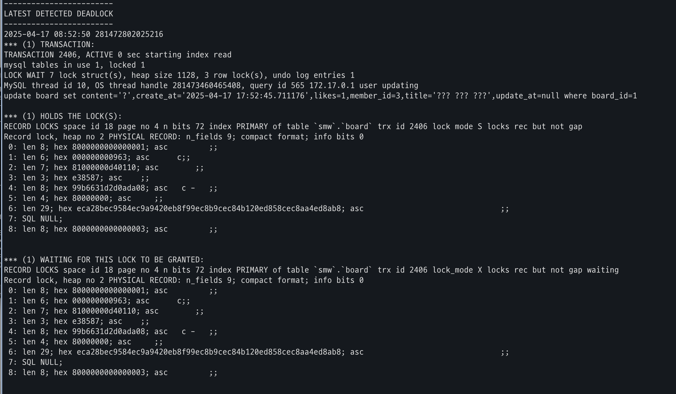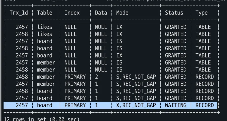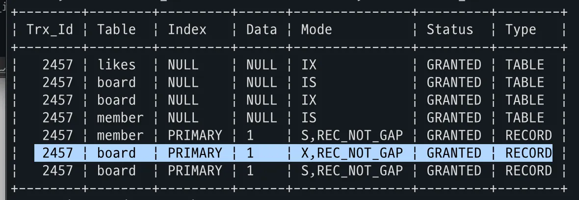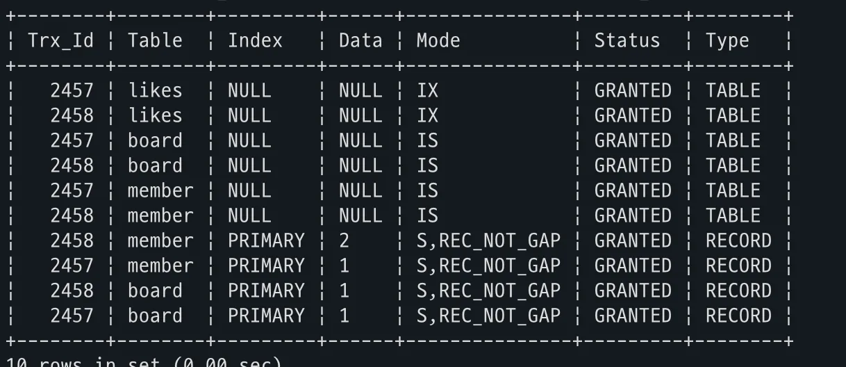 사진을 보면 서로 다른 트랜잭션 id가 각각 s-lock을 획득한걸 볼 수 있다.