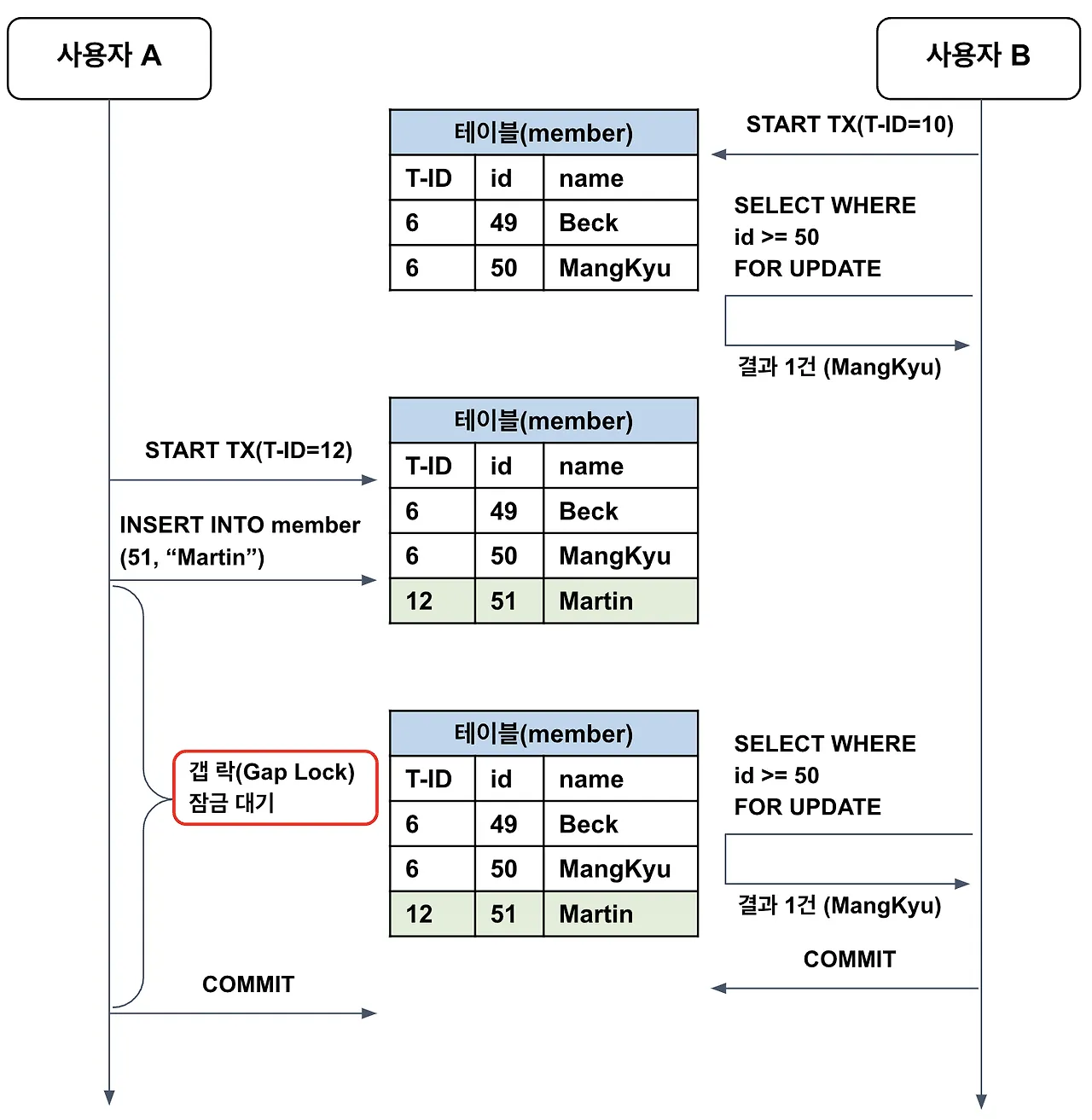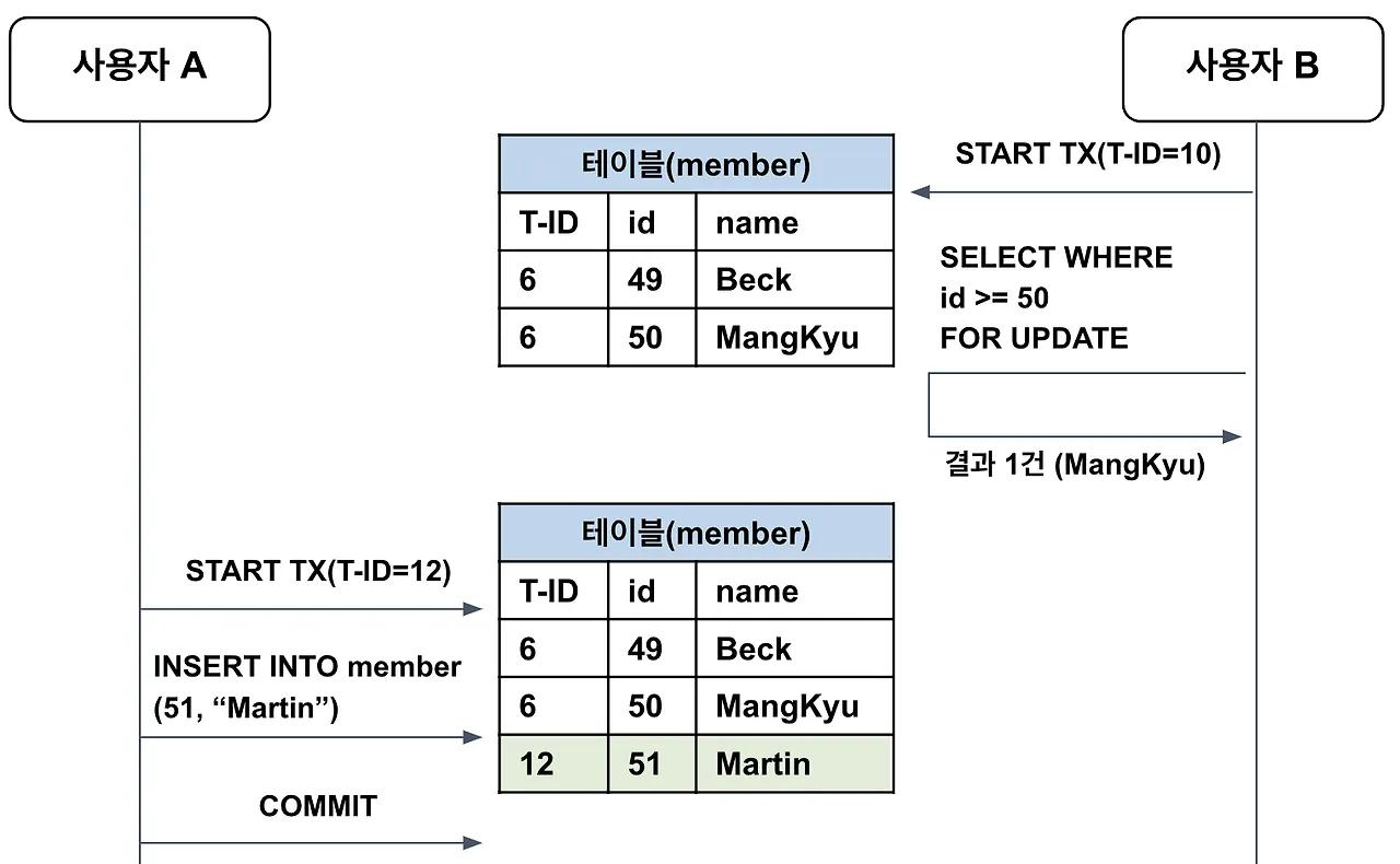 MySQL에는 Gap Lock이 존재한다. MySQL에는 갭 락이 존재하기 때문에 위의 상황에서 문제가 발생하지 않는다. 사용자 B가 SELECT FOR UPDATE로 데이터를 조회한 경우에 MySQL은 id가 50인 레코드에는 레코드 락, id가 50보다 큰 범위에는 갭 락으로 넥스트 키 락을 건다. 따라서 사용자 A가 id가 51인 member를 INSERT 시도한다면, B의 트랜잭션이 종료(커밋 또는 롤백)될 때 까지 기다리다가, 대기를 지나치게 오래 하면 락 타임아웃이 발생하게 된다.