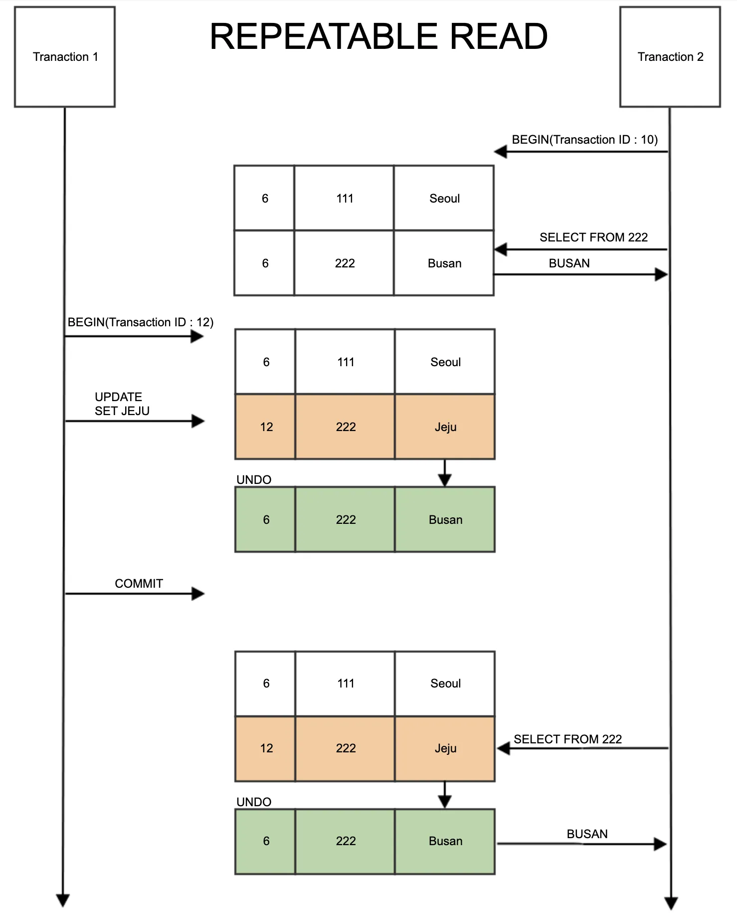 lock이 사용되는 경우 phantom Read가 발생하게 된다. lock을 사용하면 undo log를 읽는 것이 아니라 테이블에서 조회하게 된다. 아래와 같이 쓰기 잠금(for update) / 읽기 잠금(for share)을 사용한 경우가 해당 된다.