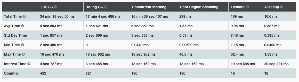 보면 Full GC를 수행하는데 가장 많은 시간을 차지한다. full GC가 총 452번 수행되면서 34분 18초를 멈추었다는 말이된다. full GC는 STW 이벤트를 발생시키고 모든 애플리케이션 스레드가 정지되고 ,GC만 작동하므로 사용자 입장에서 앱이 멈춘 것처럼 느껴지는 것이다.