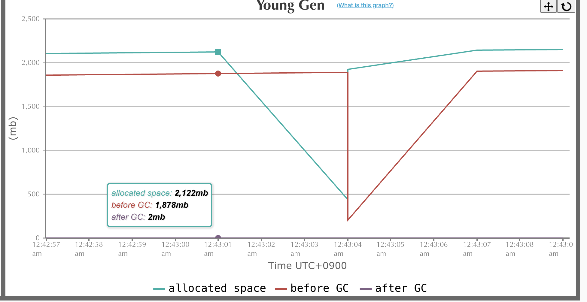 이 그래프 메모리 할당률은 새 객체가 Eden 영역에 할당되는 지를 측정한 값이다. 즉 Allocatoin Rate은 초당 얼마만큼의 새 객체가 Eden 영역에 할당되는지를 측정한 값 -> 평균 메모리 할당률: 22.5mb/s