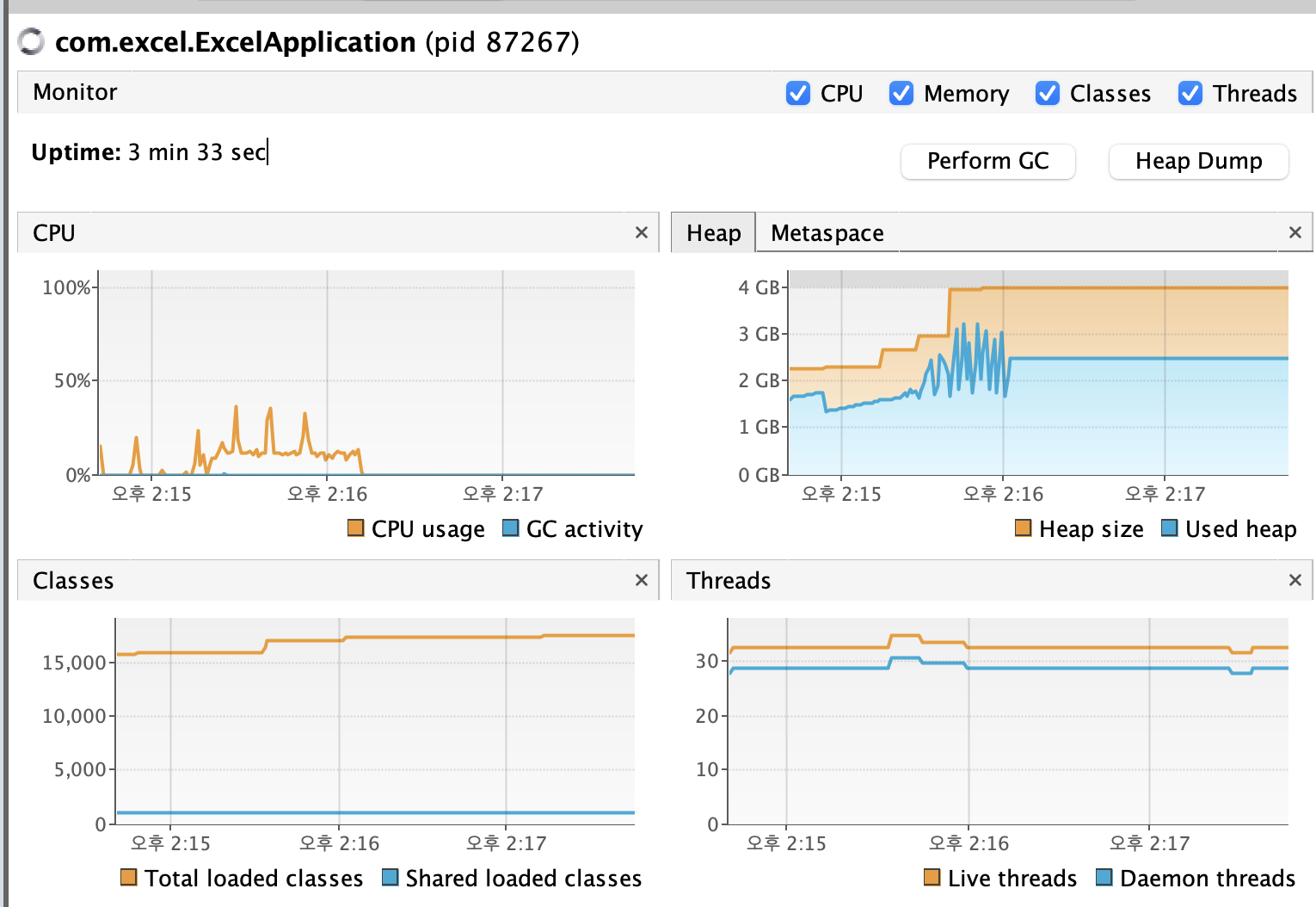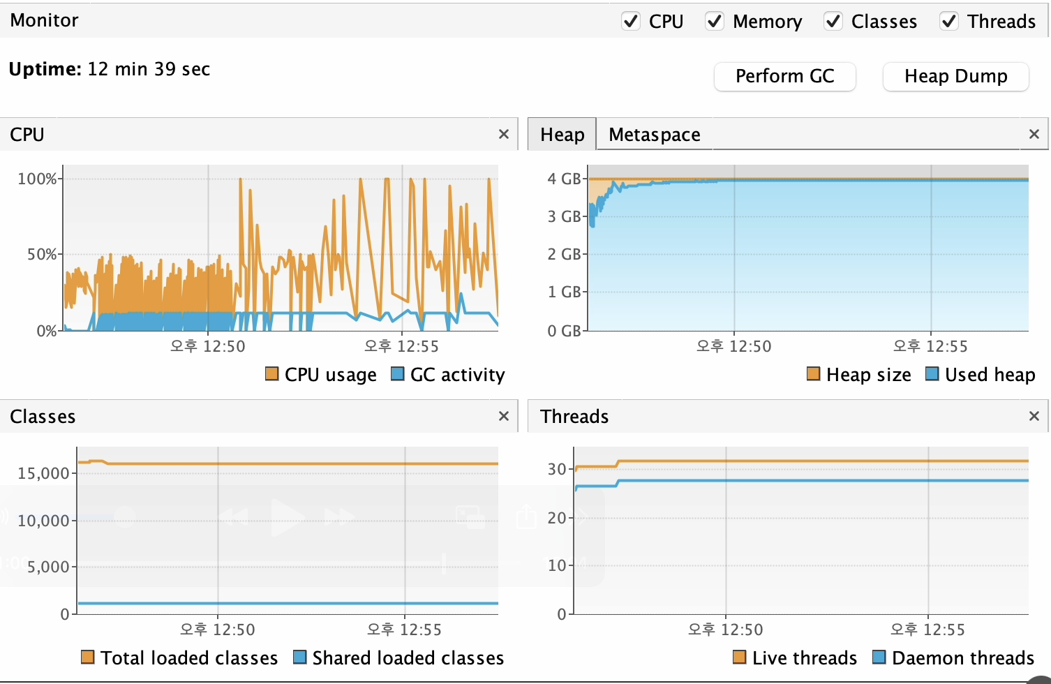 CPU사용률이 50% 도 안되는 것을 볼 수 있다. heap size는 최대 4GB까지 할당되지만 최대 메모리 사용률이 4GB를 넘지 않는다.