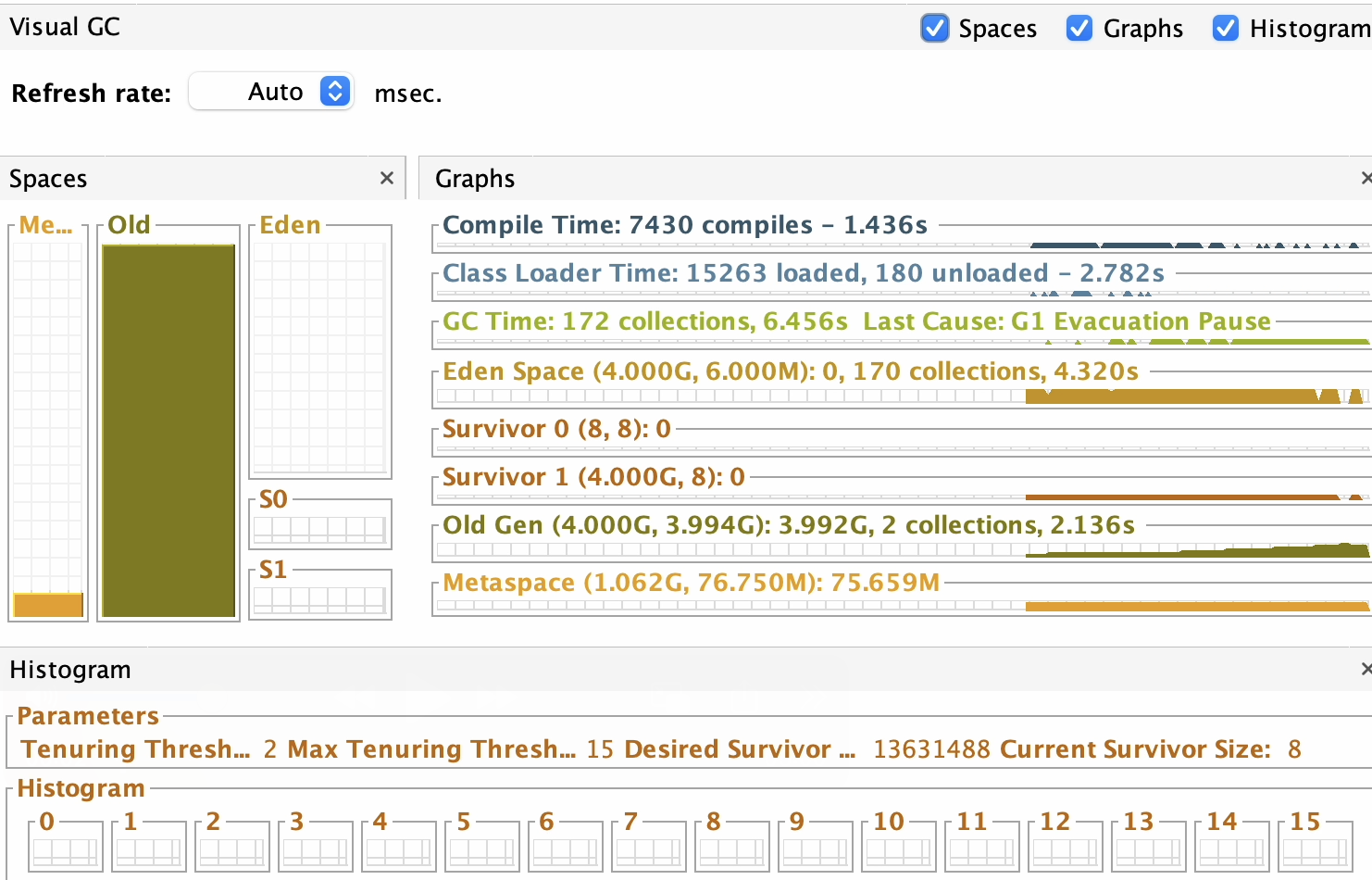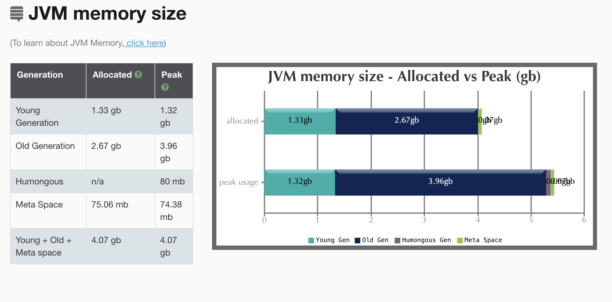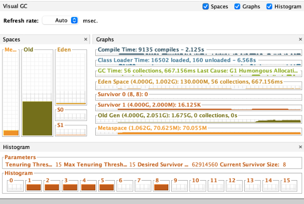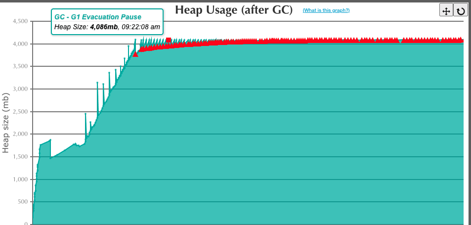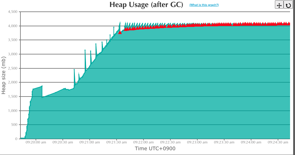 또한 JVM memory size 수치를 보면 심각하다. Old Generation peek 수치가 할당된 양을 초과한다.