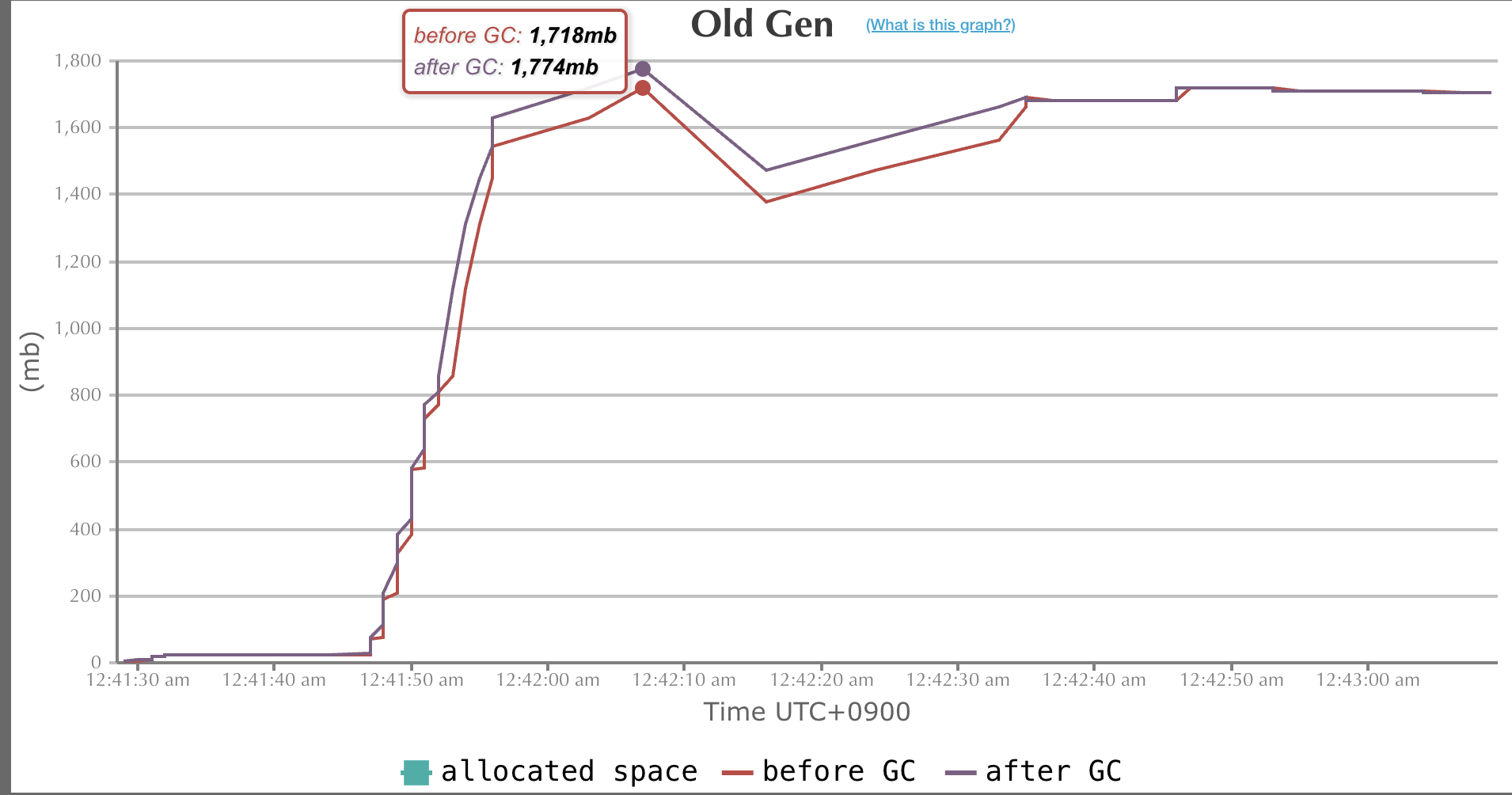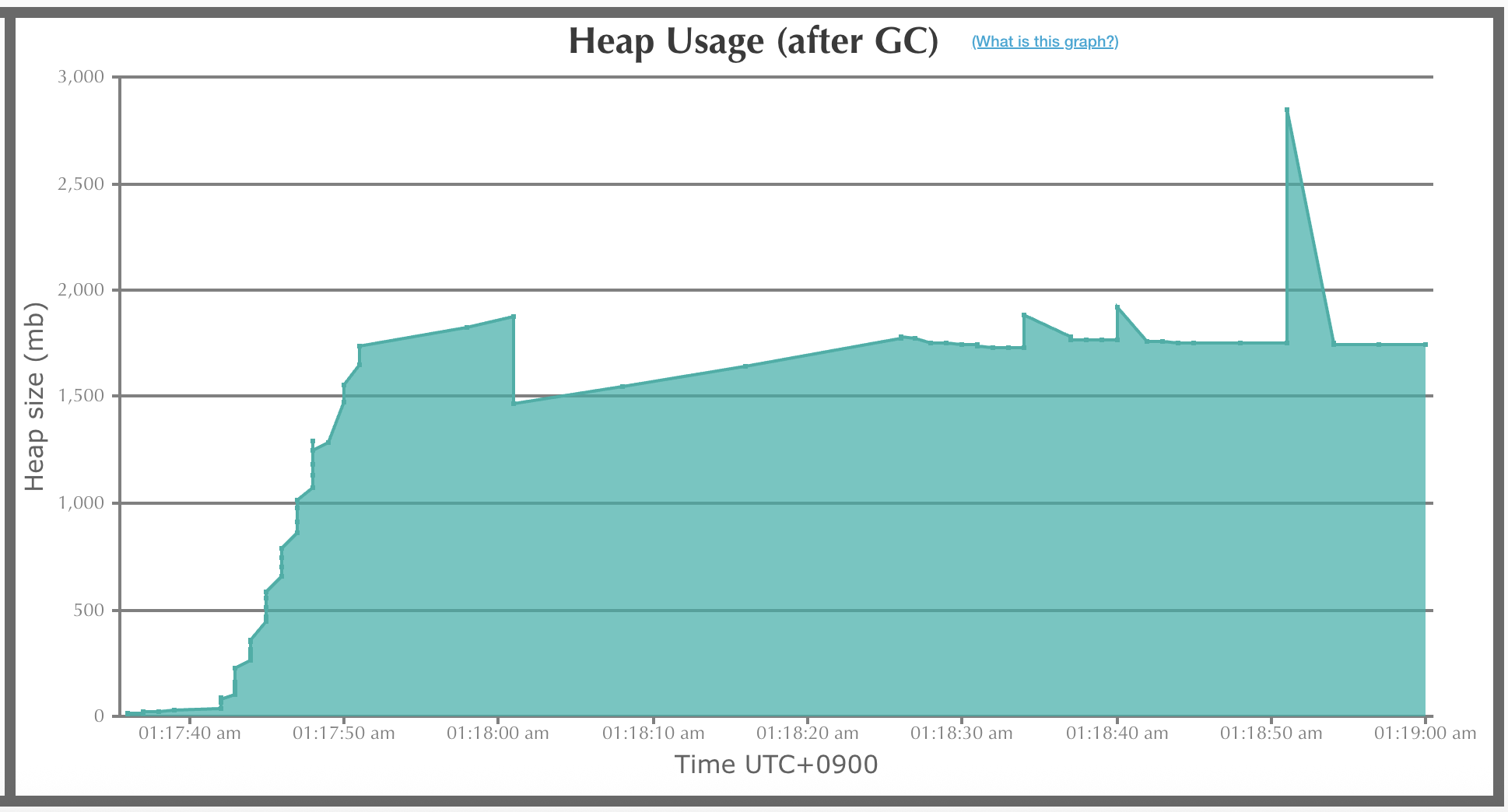 여기서 비정상적으로 스파이크가 튀다가 GC발생 후에 1,750mb 을 사용하는걸 확인할 수 있다.