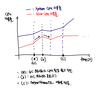 결론은 GC 병목현상으로 인한 성능 이슈였다. 유저 타임에 90%이상 사용하지 않았지만 GC 문제라는 걸 알 수 있었다.