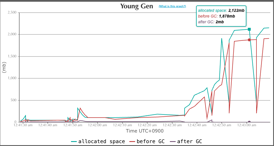 Eden영역에 메모리가 찼다가 GC발생하고, 다시 찼다가 GC 일어나고 (반복) 하는 현상을 보였다. Old 영역에는 꽉 차지 않았다. full GC가 발생하지 않았을 것으로 예상되었다.