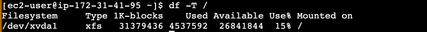 현재 파일 시스템 확인: `df -T /`