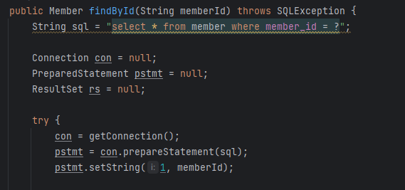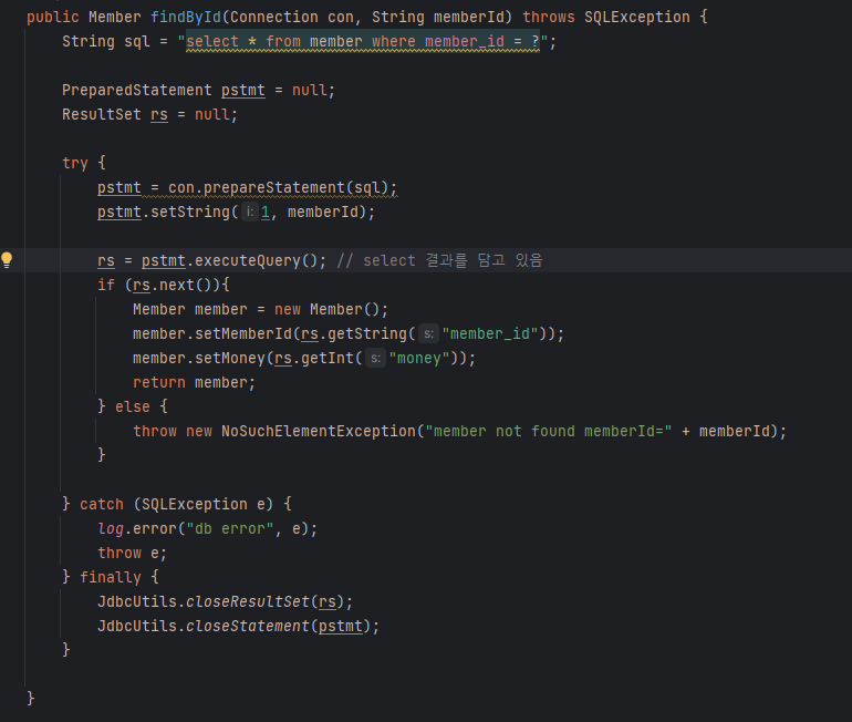 1. 커넥션 유지가 필요한 두 메서드(findById, update)는 파라미터로 넘어온 커넥션을 사용해야한다. 따라서 con = getConnection()코드가 있으면 안된다.