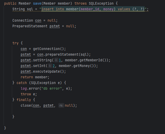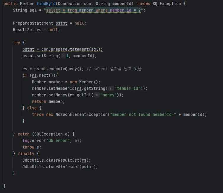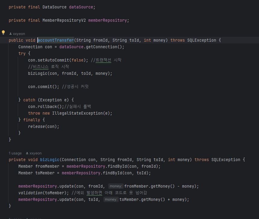 - 같은 트랜잭션을 유지하기 위해 커넥션을 파라미터로 넘겨야 한다.