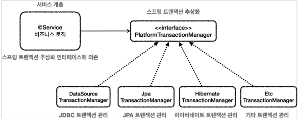 서비스는 특정 트랜잭션 기술에 직접 의존하는 것이 아니라, TxManager 라는 추상화된 인터페이스에 의존 한다. 이제 원하는 구현체를 DI를 통해서 주입하면 된다. 예를 들어서 JDBC 트랜잭션 기능이 필요하면 JdbcTxManager 를 서비스에 주입하고, JPA 트랜잭션 기능으로 변경해야 하면 JpaTxManager 를 주입하면 된다.