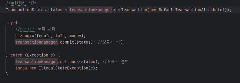 트랜잭션을 시작하고, 비즈니스 로직 실행하고, 성공하면 커밋, 예외가 발생해서 실패하면 롤백