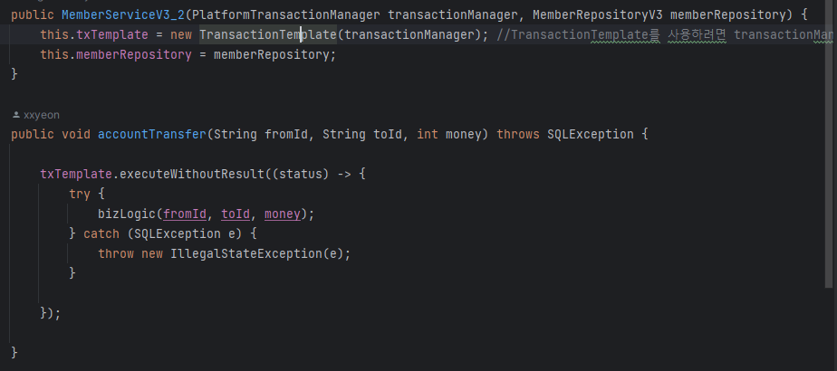 TransactionTemplate 을 사용하려면 transactionManager 가 필요하다. 생성자에서 transactionManager 를 주입 받으면서 TransactionTemplate 을 생성했다.