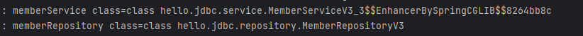 memberService 에 EnhancerBySpringCGLIB.. 라는 부분을 통해 프록시(CGLIB)가 적용된 것을 확인할 수 있다.