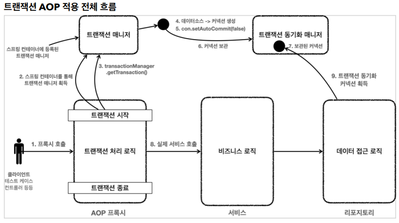개발자는 트랜잭션 처리가 필요한 곳에 @Transactional 애노테이션만 붙여주면 된다. 스프링의 트랜잭션 AOP는 이 애노테이션을 인식해서 트랜잭션 프록시를 적용해준다.