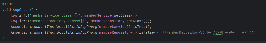 memberRepository 에는 AOP를 적용하지 않았기 때문에 프록시가 적용되지 않는다.