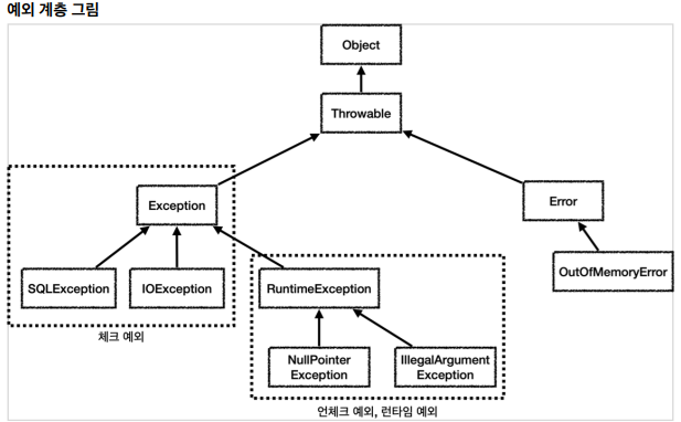 - 예외를 잡거나 던질 때 지정한 예외뿐만 아니라 그 예외의 자식들도 함께 처리된다.