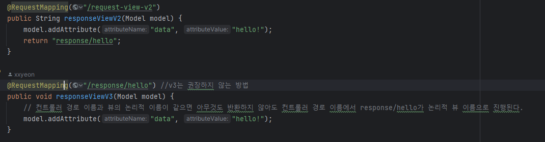 @ResponseBody가 없으면 뷰 리졸버가 실행되서 response/hello 뷰를 찾고 렌더링
