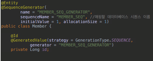 | SEQUENCE | 데이터베이스 시퀀스 오브젝트 사용, @SequenceGenerator 필요 |