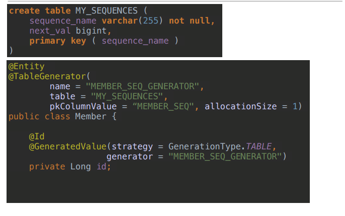 | TABLE | 키 생성용 테이블 사용, 모든 DB에서 사용, @TableGenerator 필요 |