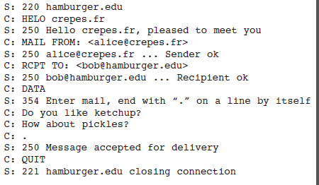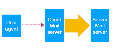 - client SMTP (local mail server) -> server SMTP (remote mail server)